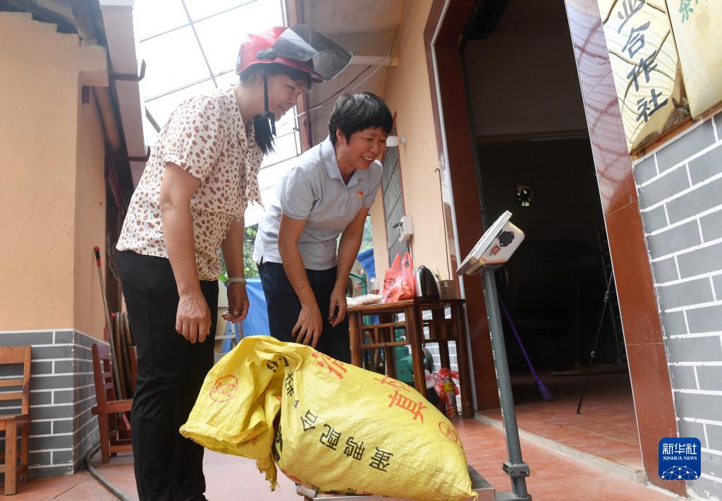在广西苍梧县六堡镇山坪村,祝雪兰(右)和村民一起称刚采回来的茶叶重量(2022年9月22日摄)。新华社记者 陆波岸 摄