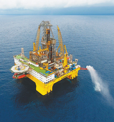 2017年2月,最大钻井深度达到15250米的超深水双钻塔半潜式钻井平台“蓝鲸1号”交付使用。
