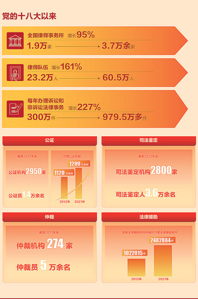加强法律服务行业规范化管理,调整、优化机构布局,法律服务工作能力显著提升。图为党的十八大以来,法律服务工作及队伍情况。