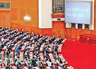 民法典是新中国成立以来第一部以“法典”命名的法律,是新时代我国社会主义法治建设的重大标志性成果,开创了我国法典编纂的先河,具有里程碑意义。图为2020年5月28日,十三届全国人民代表大会第三次会议表决通过《中华人民共和国民法典(草案)》。