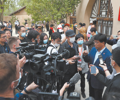国际传播影响力、中华文化感召力、中国形象亲和力、中国话语说服力、国际舆论引导力显著提升,中国故事传得更开更广,中国声音传得更响更远。图为2021年5月,境外媒体记者在陕西省延安市枣园革命旧址采访。
