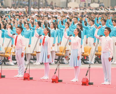坚持以社会主义核心价值观引领文化建设,注重用社会主义先进文化、革命文化、中华优秀传统文化培根铸魂,人民思想觉悟、道德水准、文明素养和社会文明程度不断提高。图为2021年7月1日庆祝中国共产党成立100周年大会上,共青团员和少先队员们发出“请党放心,强国有我”的青春誓言。