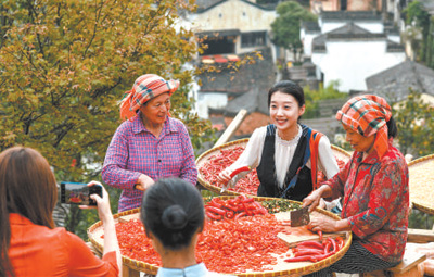 牢牢把握正确政治方向、舆论导向、价值取向,精心组织正面宣传和舆论引导,扎实开展增强“脚力、眼力、脑力、笔力”教育实践,加快推进媒体深度融合发展,主流舆论阵地进一步巩固壮大,主旋律更昂扬、正能量更强劲。图为2020年8月,在“走向我们的小康生活”主题采访中,记者在江西省婺源县篁岭村采访晒秋农户。