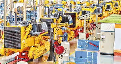 近年来,山东山推工程机械股份有限公司积极响应“一带一路”倡议,主要产品在“一带一路”沿线均有销售。图为在山推总装车间,工人正在作业。