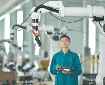 河北省任丘市通过搭建科技创新平台,建设研发中心、技术研究院,持续深化产学研合作交流,推动企业转型升级。图为工作人员在生产车间调试机器人。