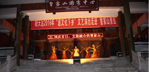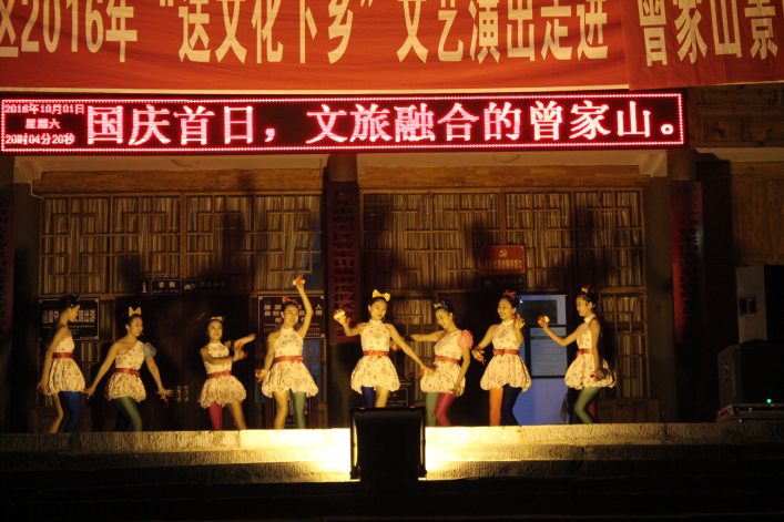 本网讯(王杰)国庆黄金周首日,为加大曾家山宣传力度、烘托国庆节日氛围、丰富景区文化资源、弘扬爱国主义情操、同心助力脱贫攻坚,曾家山景区管委会借助区委区政府主办“同心助脱贫·文化惠民生”文艺进农村慰问演出的平台,特邀该表演组成员于昨日19:30分,在游客中心为周边群众及留宿的游客献上了一场90分钟的文艺表演。(赵翠岚)