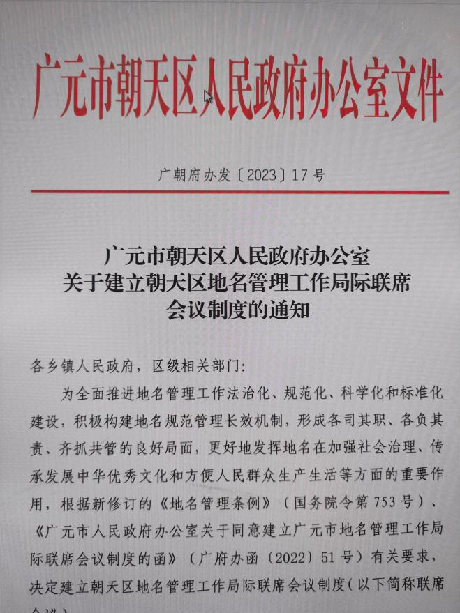 ——地名管理有序进行。建立《朝天区地名管理工作局际联席会议制度》,进一步明确了区级相关部门职能职责。严格规范地名管理,全面排查有地无名、多地重名、地名不规范等问题,共排查需新命名的地名32个。