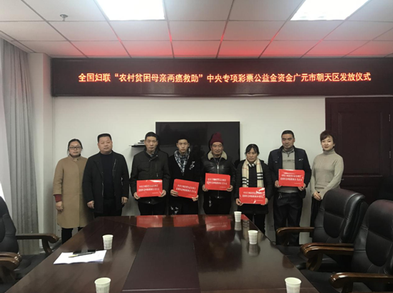 1月16日,朝天区举行全国“农村贫困母亲两癌救助”中央专项彩票公益金发放仪式,来自转斗镇、两河口乡、平溪乡的5名“两癌”贫困母亲接受了由全国妇联、全国妇基会提供的“贫困母亲两癌救助专项基金”5万元。区委常委、区委统战部部长、区总工会主席甘兴礼出席仪式并讲话。