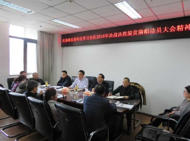 2月2日下午,区委常委、政法委书记李绍兵组织召开区委政法委机关全体党员干部会议,及时传达学习全区2018年决战决胜脱贫摘帽动员大会精神。
