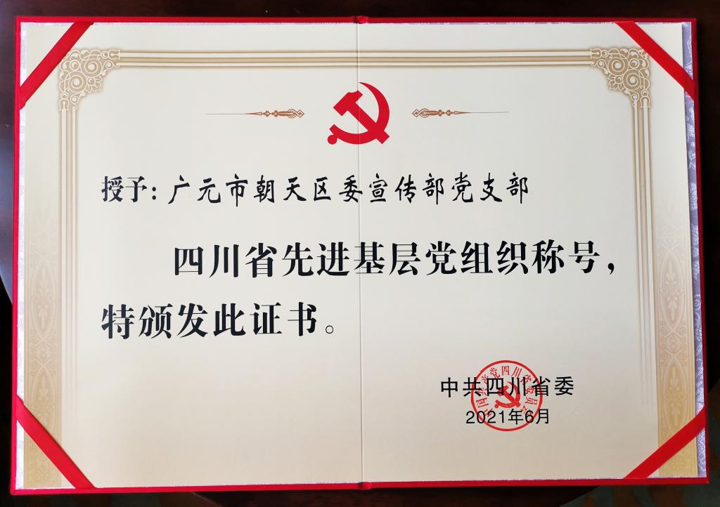 今年是中国共产党成立100周年。近日,中共四川省委印发《关于表彰四川省优秀共产党员、优秀党务工作者、先进基层党组织的决定》,表彰了优秀共产党员300名、优秀党务工作者200名、先进基层党组织300个。其中,广元市朝天区委宣传部党支部荣获“四川先进基层党组织”称号。