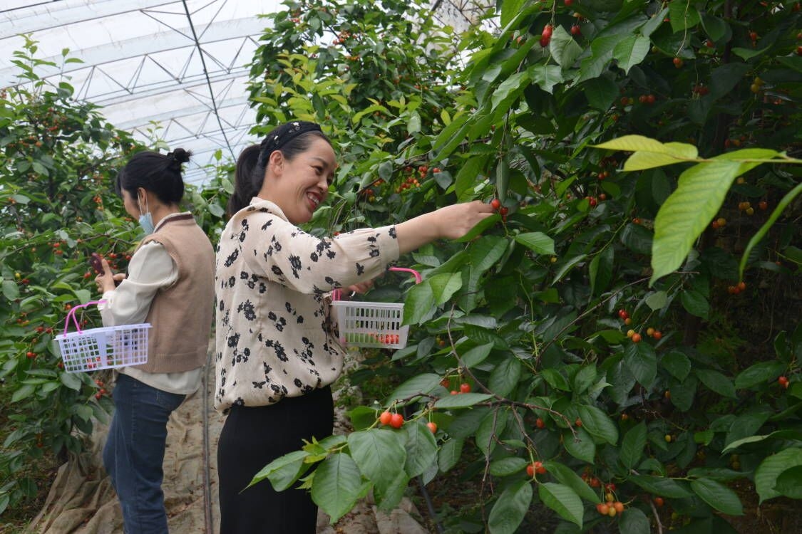 4月13日,在经测温、登记、消毒后,记者走进了樱桃大棚内,一股热气迎面扑来,一棵棵缀满红彤彤果实的樱桃树映入眼帘。用手轻轻拨开绿色树叶,一珠珠鲜红色的果子簇拥在一起,果香四溢,让人垂涎欲滴。随意咬开一个,肉厚核小,果肉纤维分明,脆甜细嫩,汁水充沛,酸甜清凉的果汁在口腔里爆开,紧实的果肉带来丰富扎实的口感,怎一个“鲜”字了得!游客们边摘边吃,还不忘拍照发朋友圈,尽情享受着惬意时光。“樱桃又大又红,看得都不想走了,就想多带一些回去和家人一起品尝。”游客郭女士说。