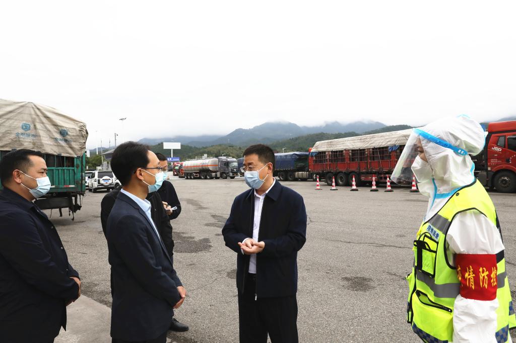 在京昆高速七盘关服务区、京昆高速中子出口和七盘关公路超限检测站等地,余飞宇认真检查了现场秩序管控、人员分流处置等工作,仔细询问了卡口力量配备、值班值守和处置工作流程等情况。他指出,高速卡口是疫情防控的前沿关卡和重要防线,要进一步落实责任、严把关口,严格规范交通卡口查验,严格落实“入川即检”要求,做好人员登记、报备、分流等工作,切实做到不漏一车一人,牢牢守住四川和广元“北大门”。要进一步优化车辆分流,加强对待检验车辆的有序引导,确保道路不拥堵、车辆不滞留。要加强对疫情防控一线工作人员的关心关爱,通过科学组织轮换轮休,让他们更好地开展工作。值班人员要进一步增强安全防范意识,做好个人防护,降低感染风险。