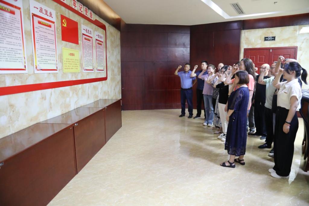 在川北家风馆,全体党员干部重温入党誓词。面对鲜红党旗,所有党员同志再一次举起右手。“我志愿加入中国共产党······永不叛党!”,大家整齐划一、铿锵有力,一字一句再次敲击着每一名党员的内心,体现了朝天审计人对党的无限忠诚。