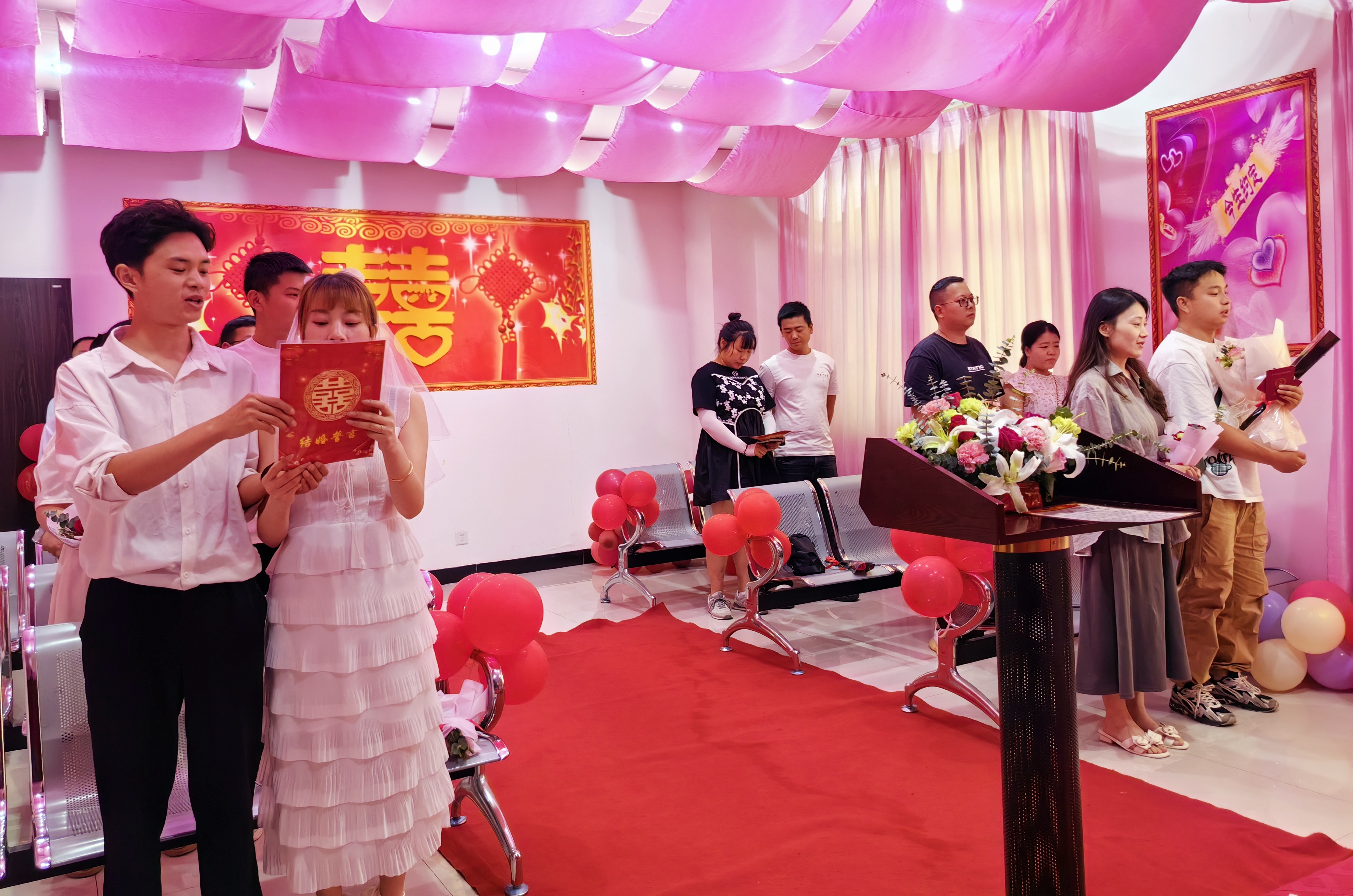 在大厅鲜花和气球簇拥的温馨浪漫氛围中,头戴白色头纱的准新娘钟琴和爱人鲜磊手牵手参加了集中颁证仪式、宣读了结婚誓词、聆听了“婚姻家庭”专题讲座,并在“抵制高价彩礼 倡导文明新风”承诺墙上郑重签下了名字,眼中有激动而幸福的晶莹闪烁。“今年公历的5月20日和21日,还正好对应到农历13、14,谐音一生一世。”钟琴告诉记者,“选取在这样多重美好寓意的日子里成为合法夫妻,是希望以后我们的每一天都能甜甜蜜蜜、幸幸福福。”