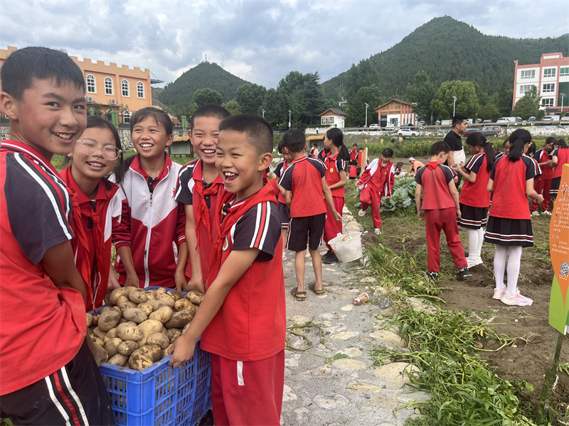 四川文明网讯(朱乔明)6月7日下午,美丽的羊木河畔,孩子们的欢声笑语回荡在四川省广元市朝天区羊木镇小学的校园周边。循声而去,还未进校园,记者的目光便被校门口的一片农田所吸引,一群小小的身影在田垄间认真地劳作着。正是土豆成熟的季节,孩子们熟练地用铲子扒开泥土挖出土豆,在他们身边,摆放整齐的土豆等待装袋。