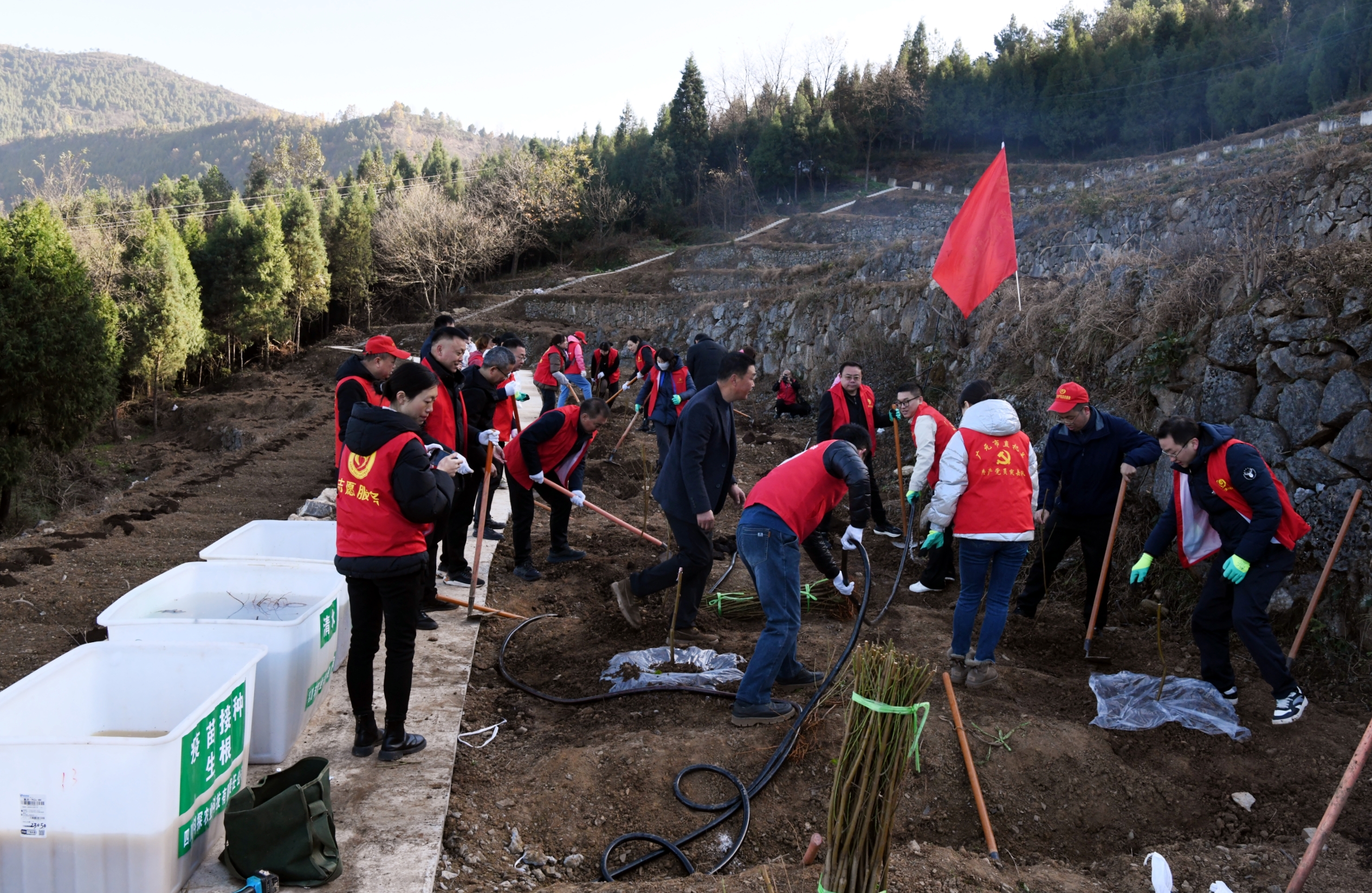 “覆土深度在桃树苗根茎的第一个侧根3—5厘米处比较合适,树苗根部周围的土垒成四周高、中间低的盘子状,定植后浇足定根水,并用地膜覆盖树盘,四周用土压实……”11月28日一大早,朝天区沙河镇唐家村冬桃产业园就开始热闹起来,广元市科协、市直机关工委、市委老干部局、朝天区沙河镇的40多名党员志愿者在沙河镇高级农艺师赵绪斌的指导下,忙碌地进行栽植冬桃树苗。