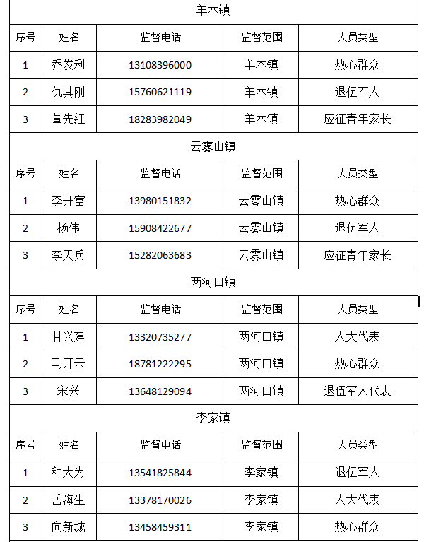 为做好廉洁征兵工作,推进阳光征兵,确保为部队输送优质兵员,根据国防部征兵办公室关于建立廉洁征兵“零报告”制度和廉洁征兵监督员制度等有关规定,现将相关廉洁征兵监督员信息予以公示。