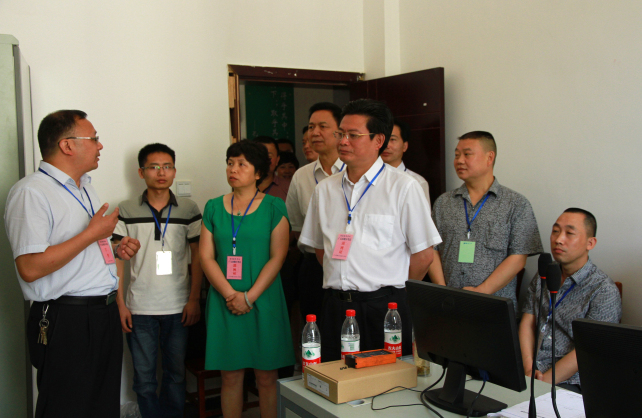 蔡邦银一行深入教育考试考务指挥中心和考务办公室,与省市高考巡视组领导及考点工作人员亲切交谈,详细了解学校在安全保卫、电子监控、食品卫生安全、医疗救护及无线监控等方面的情况。