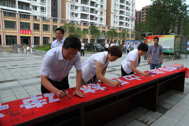 蔡邦银等四大班子领导在万人签名活动现场的“实现伟大中国梦 建设美丽繁荣和谐四川”长卷上进行了签名。