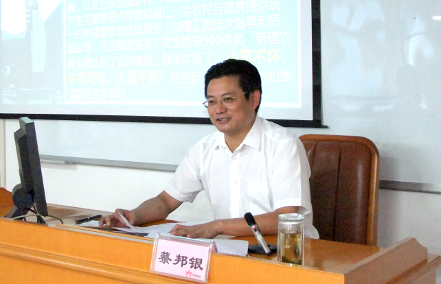 蔡邦银从朝天区情、近年来防震减灾工作做法、防震减灾三大体系建设及防震减灾对我区经济社会促进作用等4个方面进行了全面生动的阐述。