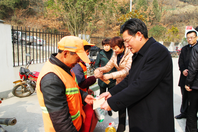 随后,蔡邦银、伏玉琼一行向春节期间坚守在工作一线的环卫工人辛苦的劳动表示感谢,并为他们送去了慰问品和慰问金,祝大家过一个欢乐祥和的新春佳节。蔡邦银、伏玉琼说,环卫工人不畏寒暑,不分昼夜,坚守岗位,为营造良好的市容环境做出了重要贡献,希望大家继续发扬成绩,克服困难,再接再厉,为建设美丽朝天再立新功。