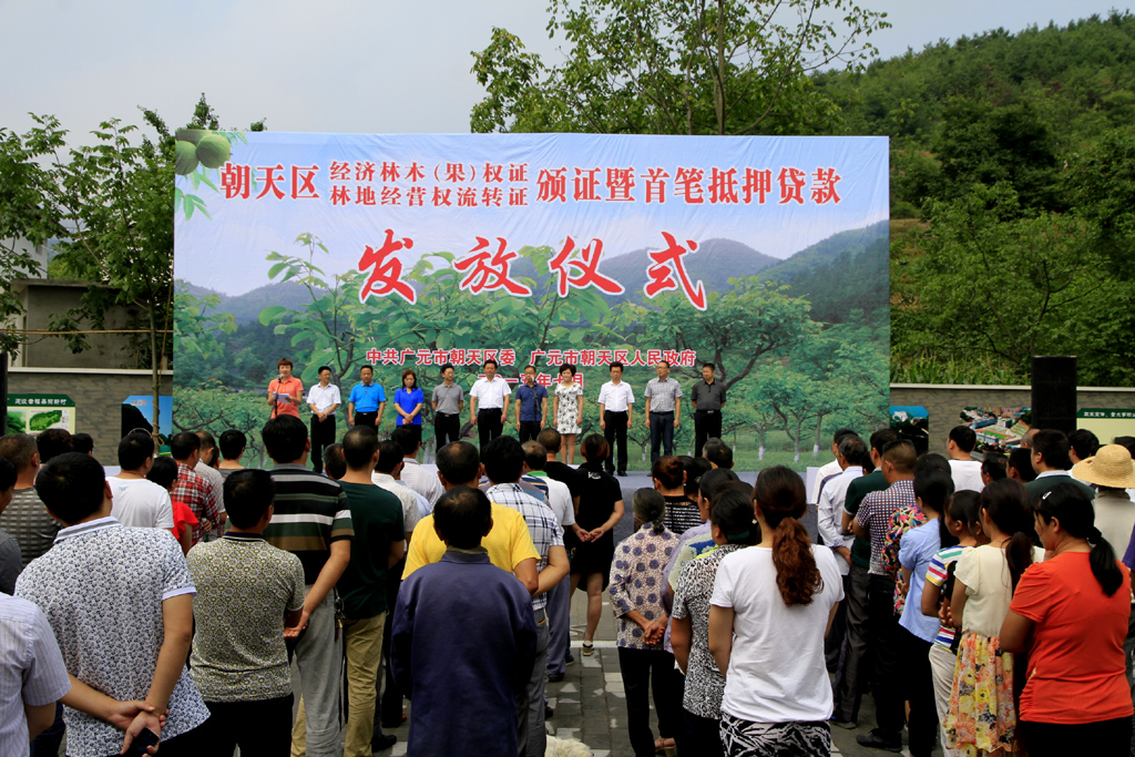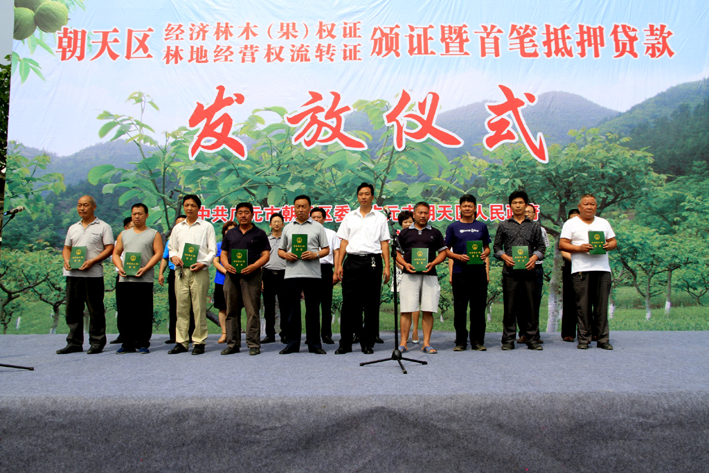 作为全省林权抵押贷款试点县区,朝天区以核桃树为试点品种,在全区10个核桃产业重点乡镇试点,给林农和核桃专合组织核发《经济林木(果)权证》和《林地经营权流转证》,赋予经济林木(果)证和林地经营权流转证抵押贷款的权能,引入金融资本,破解核桃产业发展资金难题,帮助林农和核桃专合组织经营经济木(果)、林地,发展状大核桃产业。