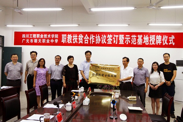 在朝天职业中学,四川工程职业技术学院与朝天职业中学签订了职教扶贫合作协议,并授予朝天职业中学为四川工院职教扶贫示范基地。杨跃向与会人员详细介绍了四川工程职业技术学院办学条件、优势学科及教育扶贫计划等相关情况。他表示,四川工程职业技术学院党委将继续发挥好高职院校在脱贫攻坚中的独特优势,创新教育扶贫模式,努力为朝天培养职业技术人才,同时有针对性地开展面向农村贫困家庭劳动力的技能培训,更好帮助他们就业脱贫,真正实现成才一人、脱贫一家,助力朝天脱贫攻坚。