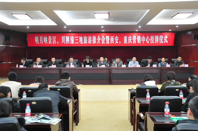 本网讯:3月23日,“明月峡景区、川陕渝三地旅游推介会暨西安重庆营销中心签约授牌仪式”在区文化中心举行。来自川陕渝三省的200余家商家和旅行社参加这次旅游营销盛会。区委常委、宣传部长张大鸿出席会议并讲话,副区长杜林主持会议。
