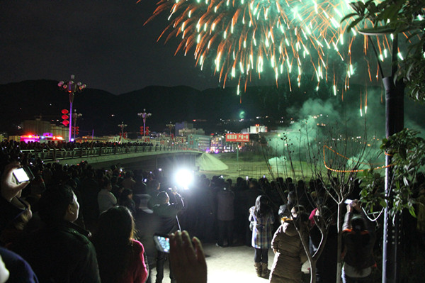 晚8点整,随着一声喜庆的巨响,顷刻间,春雷响彻朝天夜空,200米“宇宙飞星”掠过长空,飞向嘉陵江河道中央,几十米高的“金龙狂舞”焰火光芒四射,拉开了焰火晚会的滚滚春潮。“朝天区委区政府向全区人民拜年”的彩色字幕格外耀眼,烘托出浓浓的节日气氛。“凌空金菊”“牡丹”、“红菊”、“金椰林”、“银椰林”、“金龙腾飞”等上百种形态各异、色彩缤纷的礼花,以不同花型次第腾空而起。发散而下的烟花,如鸟群飞过,似嫩柳摇曳,像金龙飞舞,如山呼海啸。现场观众看得如醉如痴,人人屏住呼吸等待一个个高潮的到来。城区群众无不被这一幅幅精彩的空中立体图画深深陶醉。