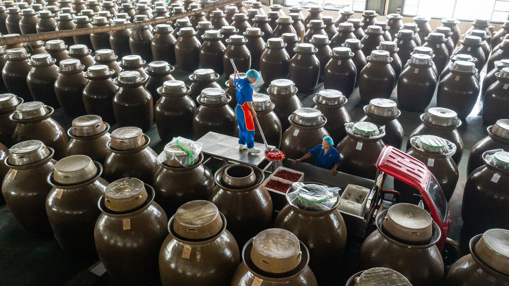 位于四川省眉山市的四川老坛子食品有限公司的工人在捞取已经腌制好的泡菜(2022年6月24日摄,无人机照片)。新华社记者 沈伯韩 摄