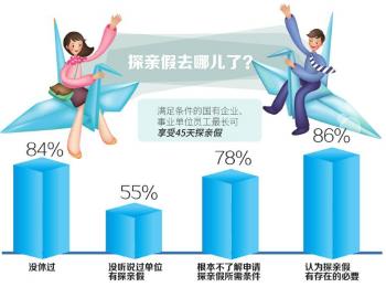 尽管如此,在得知国家曾在1981年专门出台过探亲假后,共有405位网友认为探亲假有存在的必要,占到总人数的86%。在探亲假的支持者之中,参与调查的文丽说,国家当初设立探亲假,并出台相关规定,初衷就是为了让人“常回家看看”,有时间陪陪配偶,有时间陪陪年老的父母,“因为交通发达了,探亲假可以适当缩短,但不应该废止。”