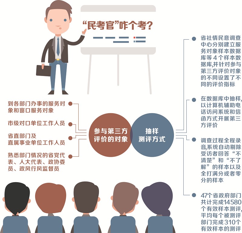 测评工作中,省社情民意调查中心在数据库中抽样,以计算机辅助电话访问系统和信函方式开展对省政府部门的第三方评价,调查过程全程录音,系统自动剔除受访者回答“不清楚”和“不了解”的样本,以及全打满分或者零分的样本,以进一步降低调查误差。47个省政府部门共计完成14580个有效样本测评,平均每个被测评部门完成了310个有效样本的测评。“由于省政府部门绩效测评工作参与对象熟悉省政府部门工作情况,数据库准备充分,测评手段现代化,保证了本次省政府部门绩效管理第三方评价工作测评覆盖范围广、被抽查人员配合程度高、测评结果客观真实。”省社情民意调查中心副主任杨宜武说。