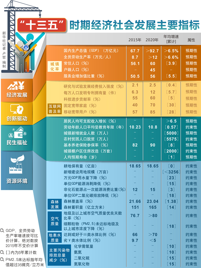 今后五年,中国经济发展的潜力在哪里?“十三五”规划纲要草案中公布的六个指标,折射出中国发展的空间与前景。