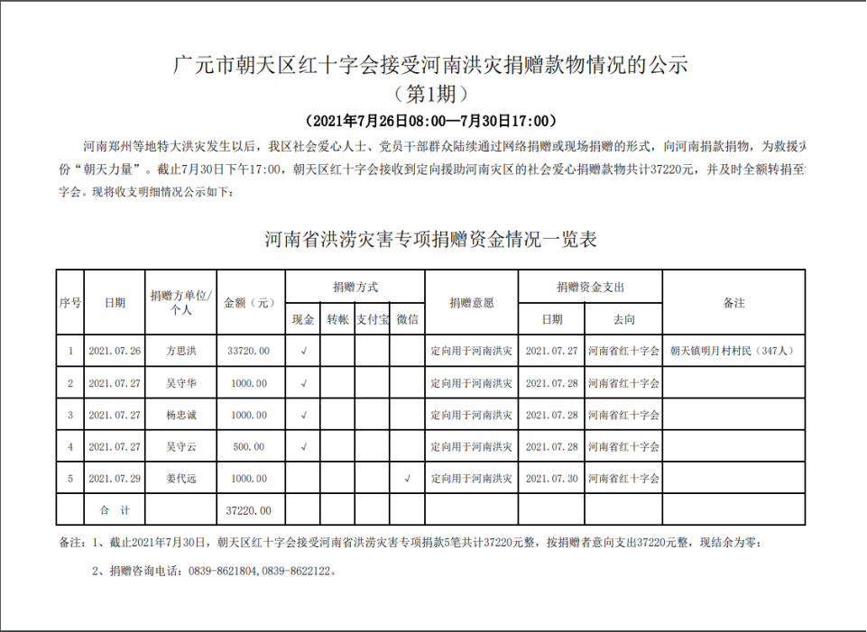 朝天区红十字会接受河南洪灾捐赠款物情况的公示(第一期)