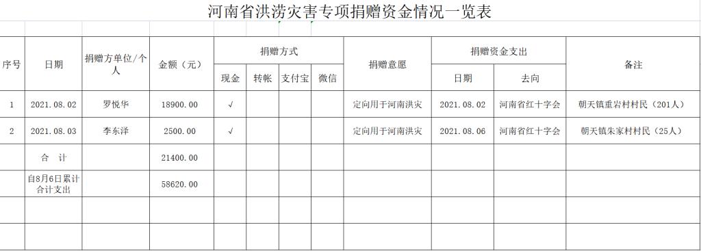 备注:1、截止2021年8月6日,朝天区红十字会接受河南省洪涝灾害专项捐款2笔共计21400元整,按捐赠者意向支出21400元整,现结余为零;