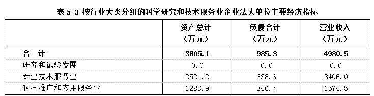 2023年末,科学研究和技术服务业企业法人单位资产总计3805.1万元,比2018年末增长859.9%;负债合计985.3万元,比2018年末增长14828.9%。