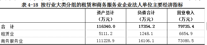 2023年末,租赁和商务服务业企业法人单位资产总计116340.0万元,比2018年末增长139.6%。其中,租赁业企业法人单位资产总计5111.2万元,商务服务业企业法人单位资产总计111228.9万元,分别比2018年末增长102.9%和141.6%。租赁和商务服务业企业法人单位负债合计17354.2万元,比2018年末增长678.1%。