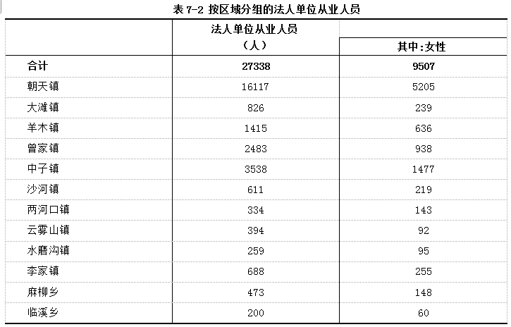 在法人单位从业人员中,位居前三位的乡镇分别是朝天镇、中子镇、曾家镇。