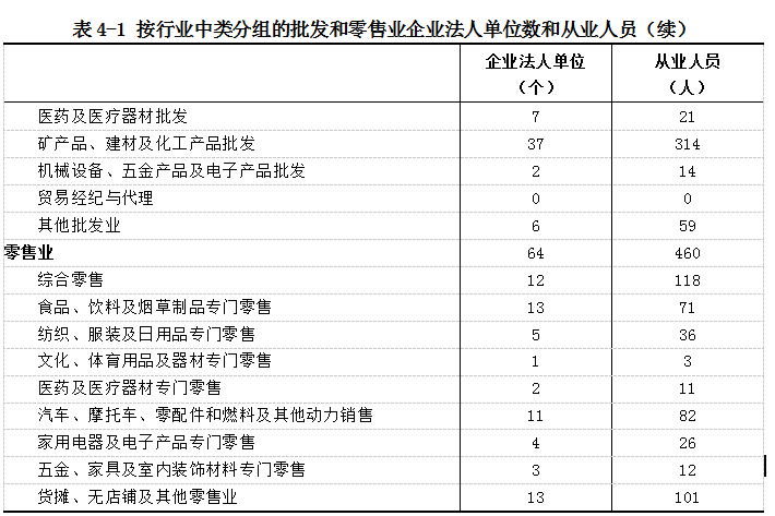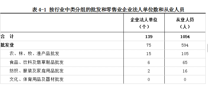 2023年末,全区共有批发和零售业企业法人单位[3]139个,从业人员1054人,分别比2018年末增长13.0%和9.9%。