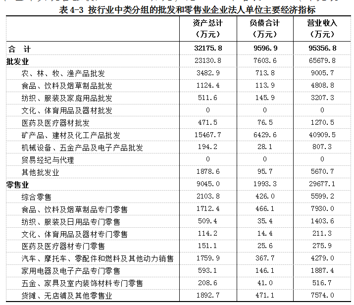 在批发和零售业企业法人单位中,批发业占54.0%,零售业占46.0%。在批发和零售业企业法人单位从业人员中,批发业占56.4%,零售业占43.6%(详见表4-1)。