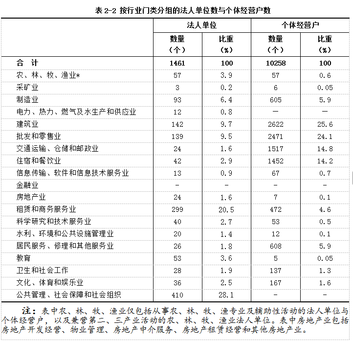 在第二产业和第三产业法人单位中,位居前三位的行业是:公共管理、社会保障和社会组织410个,占28.1%;租赁和商务服务业299个,占20.5%;建筑业142个,占9.7%。在个体经营户中,位居前三位的行业是:建筑业2622个,占25.6%;批发和零售业2471个,占24.1%;