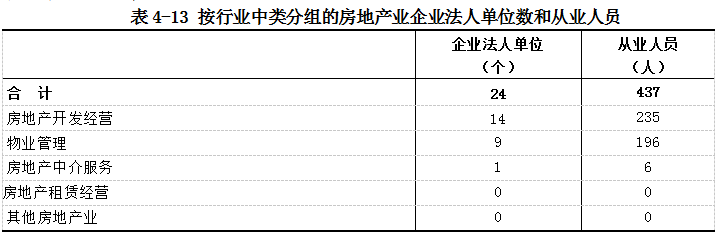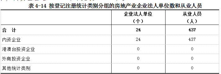 在房地产业企业法人单位从业人员中,内资企业占100%(详见表4-14)。