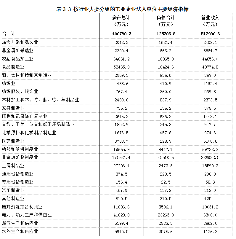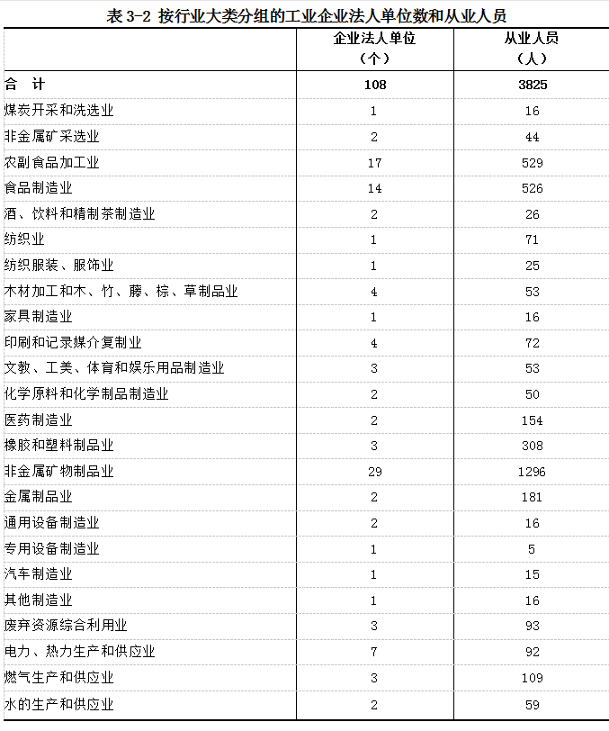 在工业企业法人单位中,采矿业3个,制造业93个,电力、热力、燃气及水生产和供应业12个,分别占2.8%、86.1%和11.1%。在工业行业大类中,非金属矿物制品业、农副食品加工业、食品制造业企业法人单位数位居前三位,分别占26.9%、15.7%和13.0%。
