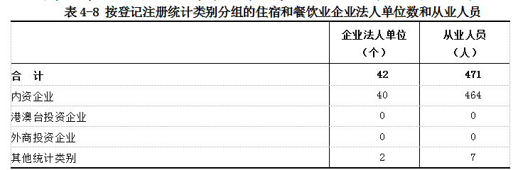 2023年末,全区共有住宿和餐饮业企业法人单位42个,从业人员471人,分别比2018年末增长162.5%和276.8%。