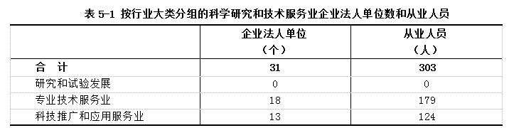 2023年末,全区共有科学研究和技术服务业法人单位40个,从业人员374人,分别比2018年末增长81.8%和619.2%。其中,企业法人单位[4]31个,从业人员303人,分别比2018年末增长520%和1065.4%(详见表5-1)。