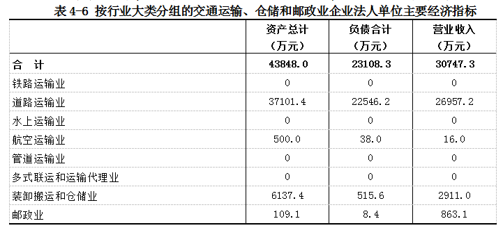 2023年末,交通运输、仓储和邮政业企业法人单位资产总计43848.0万元,比2018年末增长21.7%;负债合计23108.3万元,比2018年末增长18.4%。