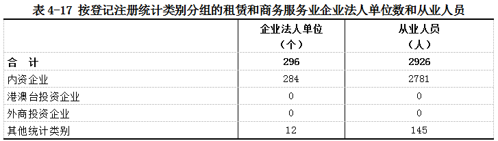 在租赁和商务服务业企业法人单位从业人员中,内资企业占95.0%,其他统计类别占5.0%(详见表4-17)。