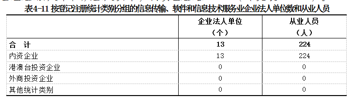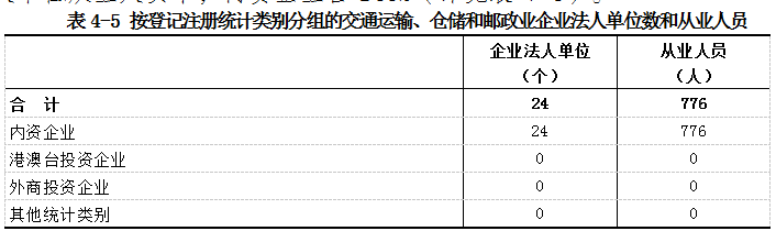 在交通运输、仓储和邮政业企业法人单位从业人员中,内资企业占100%(详见表4-5)。