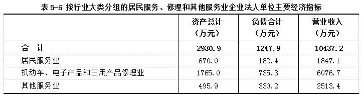2023年末,居民服务、修理和其他服务业企业法人单位资产总计2930.9万元,比2018年末增长182.0%;负债合计1247.9万元,比2018年末增长734.1%。全年实现营业收入10437.2万元,比2018年增长764.7%(详见表5-6)。