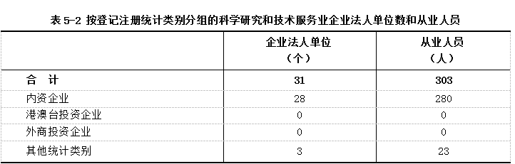 在科学研究和技术服务业企业法人单位从业人员中,内资企业占92.4%,其他统计类别(农民专业合作社(联合社))占7.6%。(详见表5-2)。
